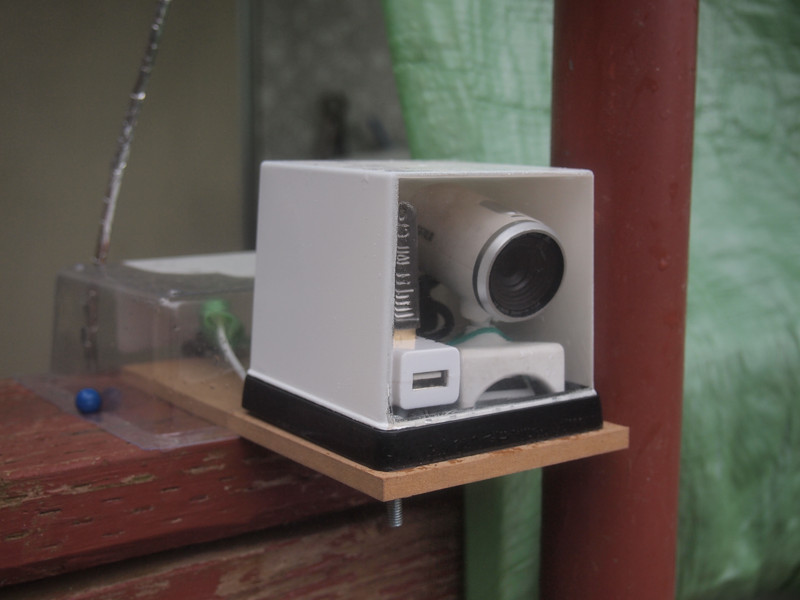 屋外設置の観測箱バージョン1。ダイソーの硬プラ展示ケースを、ダイソーのスプレー塗料で塗って、ダイソーのMDF材にねじ固定。小さすぎてケーブルが入らない、太陽光の影響で気温計測が狂う、など問題あり。いまいちなので作り直す。